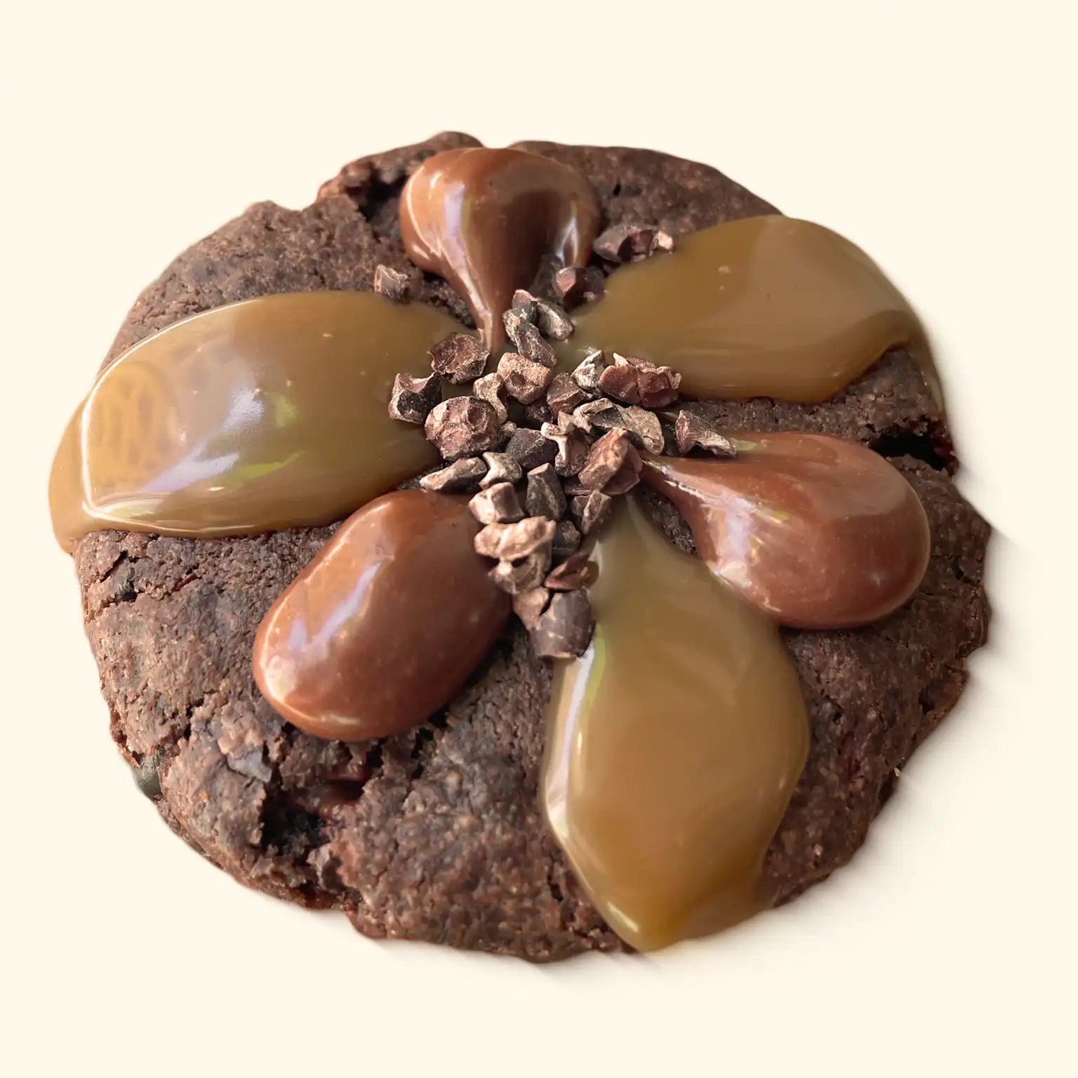 Freshly baked 70% dark chocolate chip with Organic cocoa nibs, topped off with Homemade Chocolate Caramel, and butter Caramel and more Cocoa Nibs.